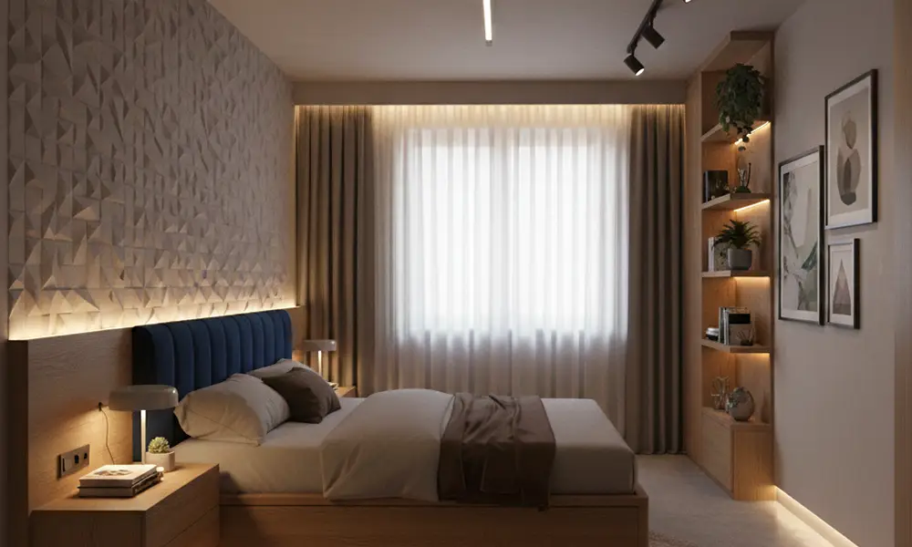 No dormitório de casal planejado e pequeno, o foco está na otimização do espaço. Cores claras, acabamentos uniformes e volumes bem proporcionados ajudam a criar sensação de amplitude. O uso de móveis multifuncionais e layouts inteligentes permite melhorar a circulação e aproveitar melhor cada centímetro do ambiente, sem comprometer conforto ou capacidade de armazenamento.
